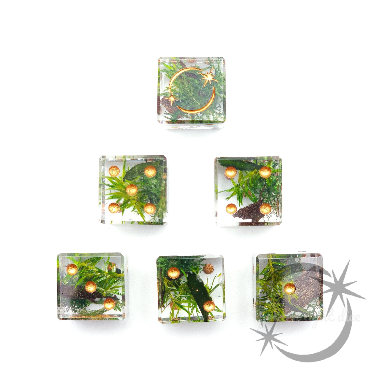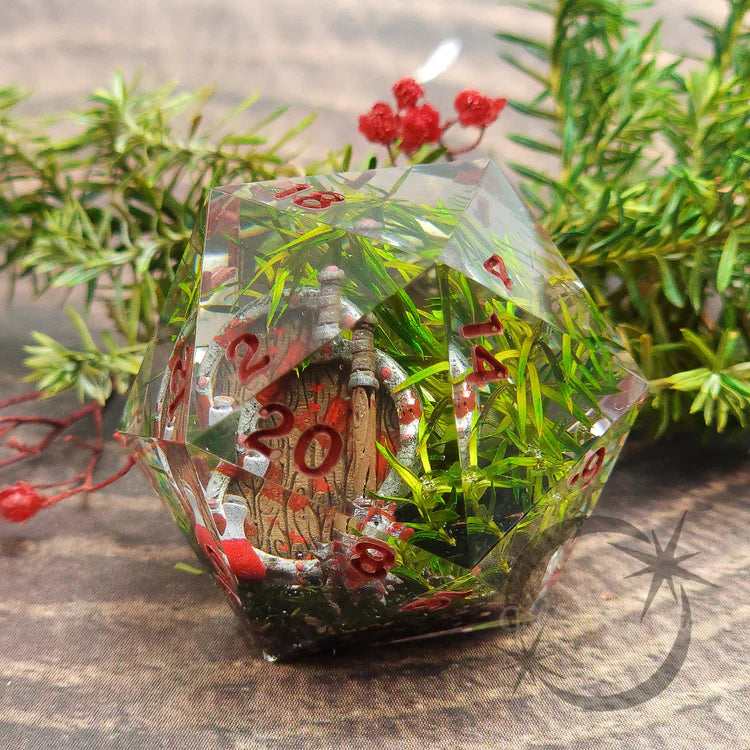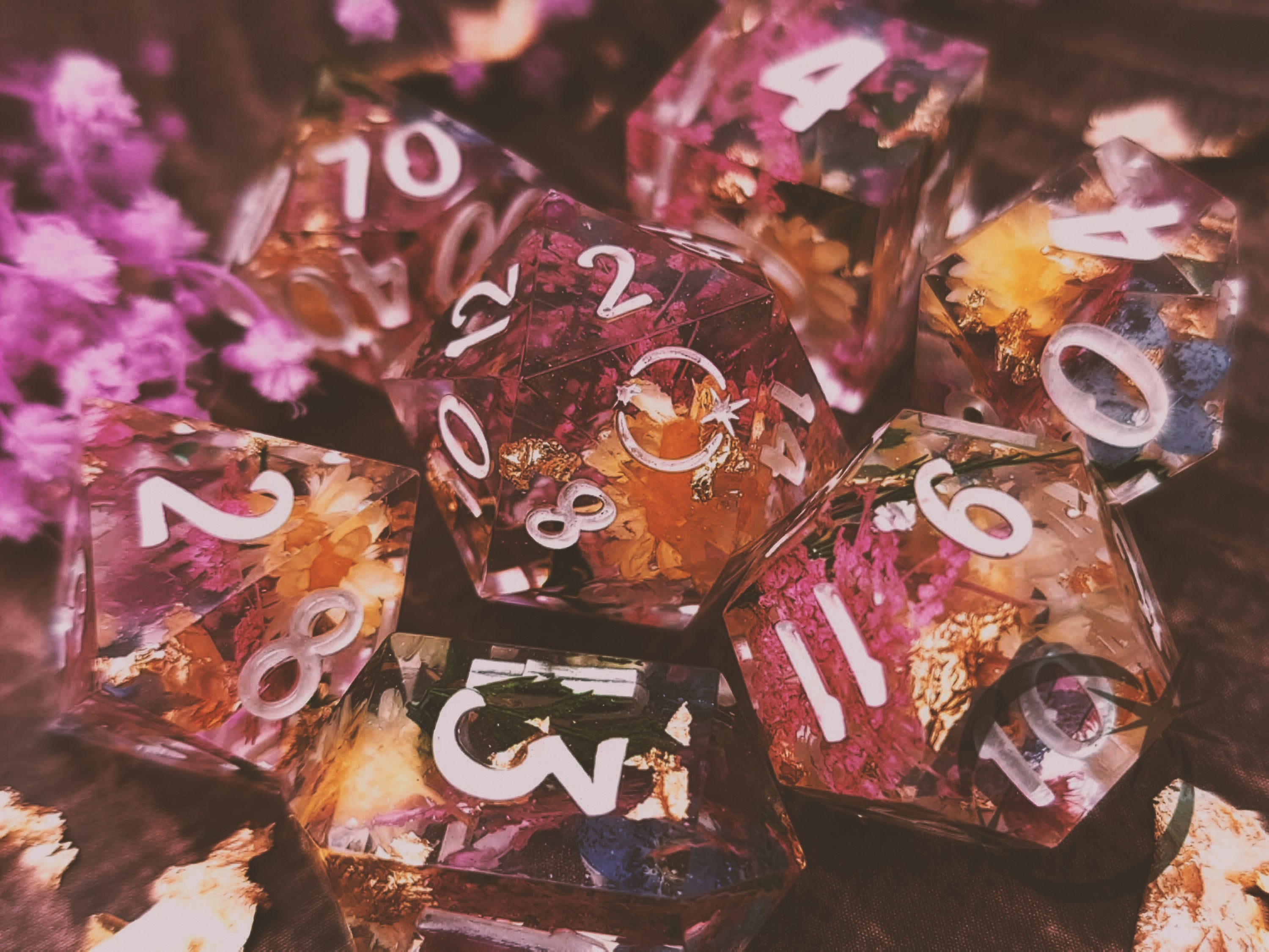 Our dice are made from epoxy resin with inserts ranging from ink and mica powders, to florals and resin cast minis.