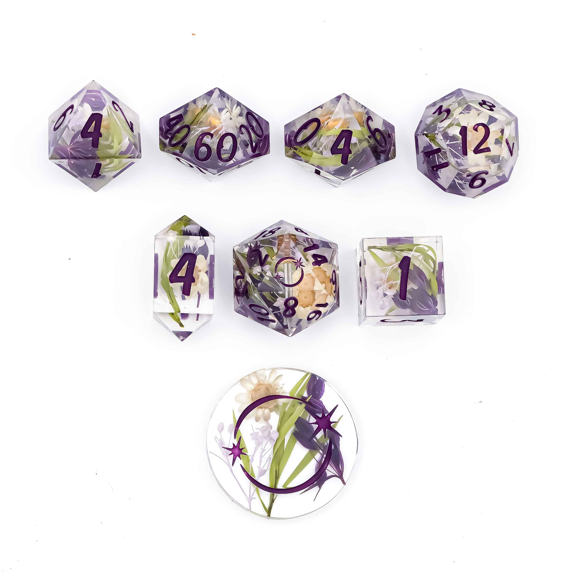 White star flowers, light purple gypsophilla, green tea grass and dark purple grasses. With a hand painted resin sword in the middle of the D20